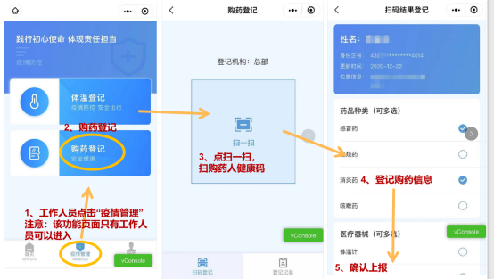 2.工作人员打开小程序扫购药人员“健康码”,登记上报购药信息。